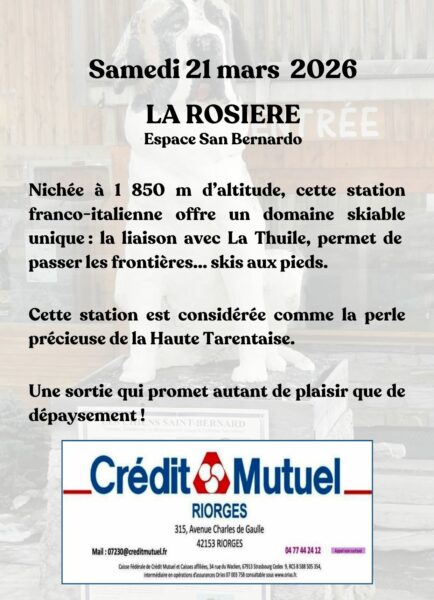 Vous souhaitez rejoindre notre sortie du 8 mars LA ROSIERE ? Ne tardez pas ! il ne reste que quelques places disponibles. Inscrivez vous dès maintenant à notre permanence les jeudis de 17h30 à 19h - Maison des Anciens Combattants 18 rue de Cadore Roanne ou se rendre sur le lien de payasso (faire un copier/coller pour y accéder) http://payasso.fr/skiclubmadeleine/paiementsorties