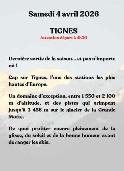 Samedi 06 avril 2024 = TIGNES (mise en place du car 4 h pour un départ 4h30)